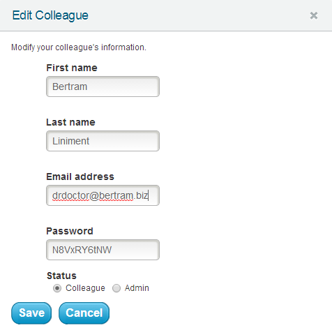 Using the Edit button, you can update an existing colleague’s name, email address, password, or status. If you need to grant an existing colleague access to all of your patients’ images, you can update his or her account here from “Colleague” to “Admin.” Once you are finished with your changes, click the Save button.